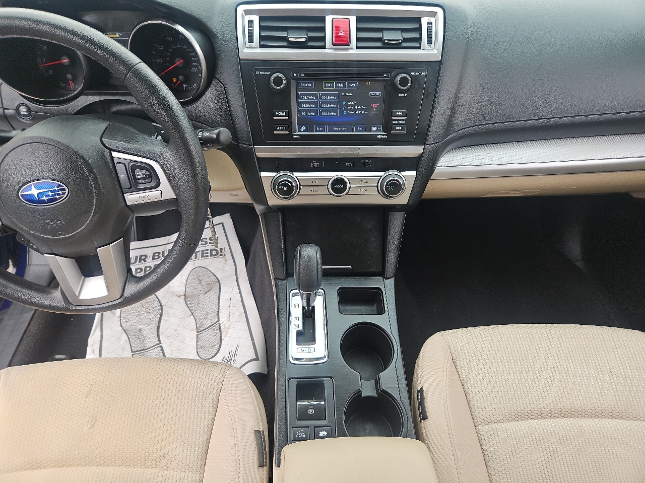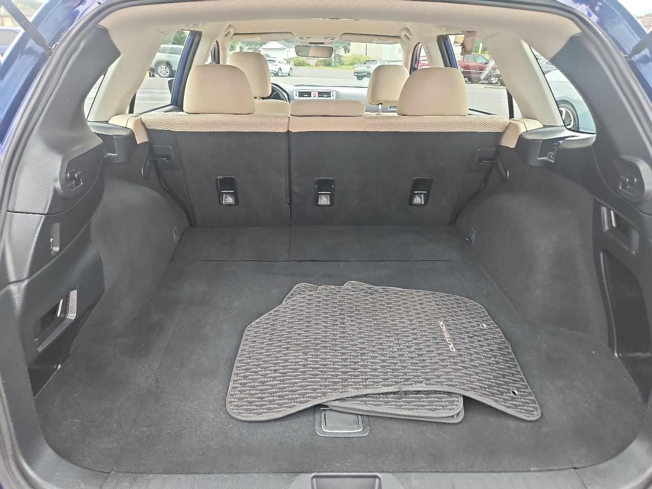 Step inside and you'll find a spacious and comfortable interior, with reclining front bucket seats and ample cargo space for all your gear. The car's entertainment system includes a radio with steering wheel controls, perfect for those long road trips.